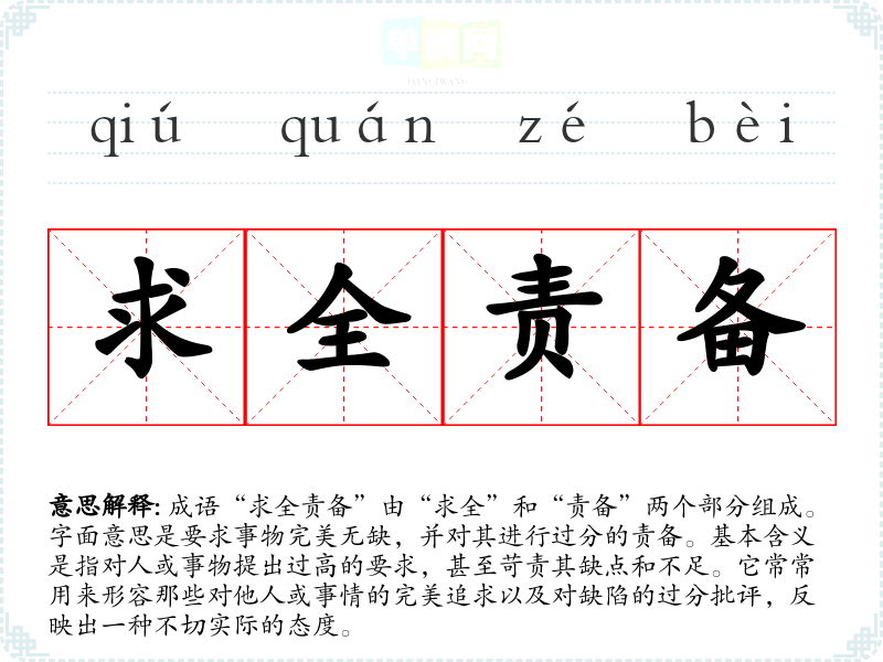 成语“求全责备”由“求全”和“责备”两个部分组成。字面意思是要求事物完美无缺,并对其进行过分的责备。基本含义是指对人或事物提出过高的要求,甚至苛责其缺点和不足。它常常用来形容那些对他人或事情的完美追求以及对缺陷的过分批评,反映出一种不切实际的态度。