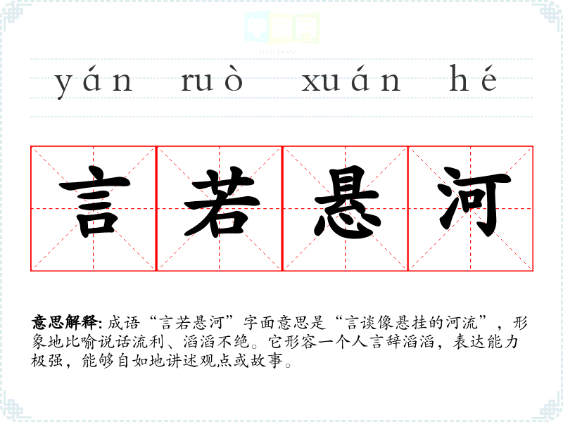 成语“言若悬河”字面意思是“言谈像悬挂的河流”,形象地比喻说话流利、滔滔不绝。它形容一个人言辞滔滔,表达能力极强,能够自如地讲述观点或故事。