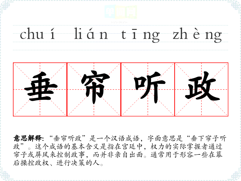 | 垂帘听政 | 垂帘:太后或皇后临朝听政,殿上用帘子遮隔。听:治理。指太后临朝管理国家政事。 |