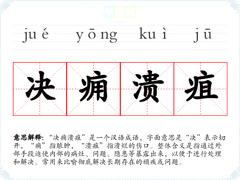 “决痈溃疽”是一个汉语成语,字面意思是“决”表示切开,“痈”指脓肿,“溃疽”指溃烂的伤口。整体含义是指通过外部手段迫使内部的病灶、问题、隐患等暴露出来,以便于进行处理和解决。常用来比喻彻底解决长期存在的顽疾或问题。