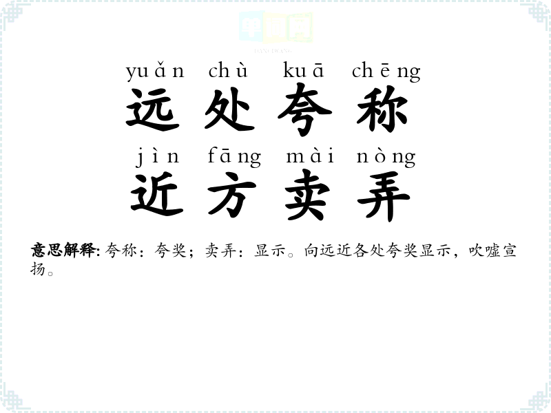 | 远处夸称,近方卖弄 | 夸称:夸奖;卖弄:显示。向远近各处夸奖显示,吹嘘宣扬。 |
