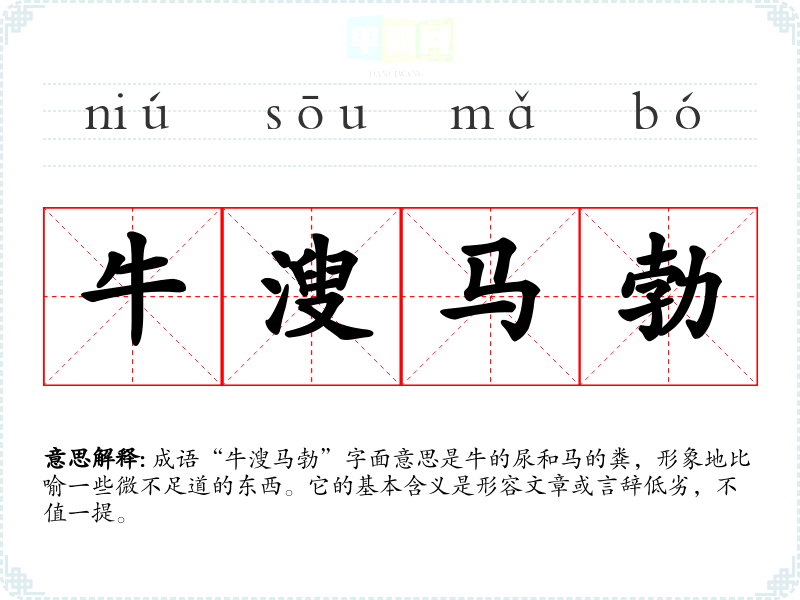 成语“牛溲马勃”字面意思是牛的尿和马的粪,形象地比喻一些微不足道的东西。它的基本含义是形容文章或言辞低劣,不值一提。