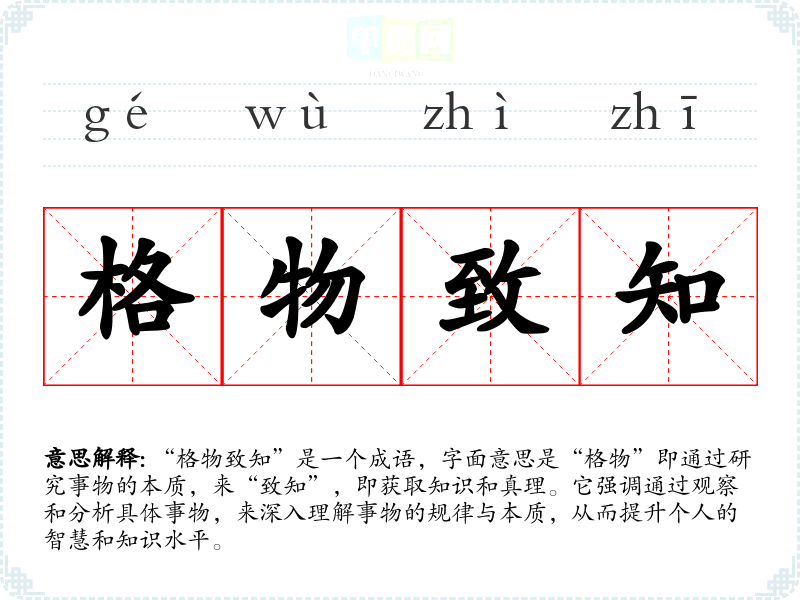 “格物致知”是一个成语,字面意思是“格物”即通过研究事物的本质,来“致知”,即获取知识和真理。它强调通过观察和分析具体事物,来深入理解事物的规律与本质,从而提升个人的智慧和知识水平。
