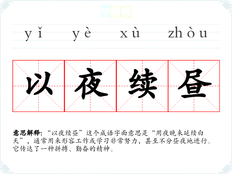 “以夜续昼”这个成语字面意思是“用夜晚来延续白天”,通常用来形容工作或学*非常努力,甚至不分昼夜地进行。它传达了一种拼搏、勤奋的精神。
