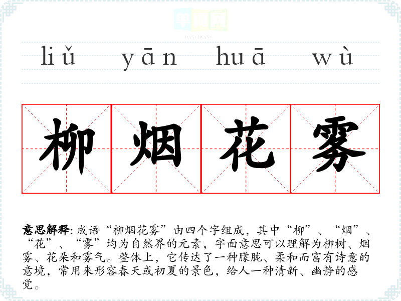 成语“柳烟花雾”由四个字组成,其中“柳”、“烟”、“花”、“雾”均为自然界的元素,字面意思可以理解为柳树、烟雾、花朵和雾气。整体上,它传达了一种朦胧、柔和而富有诗意的意境,常用来形容春天或初夏的景色,给人一种清新、幽静的感觉。