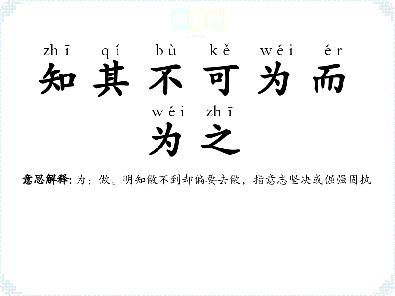 | 知之非艰,行之惟艰 | 惟:惟独。懂得道理并不难,实际做起来就难了。 |