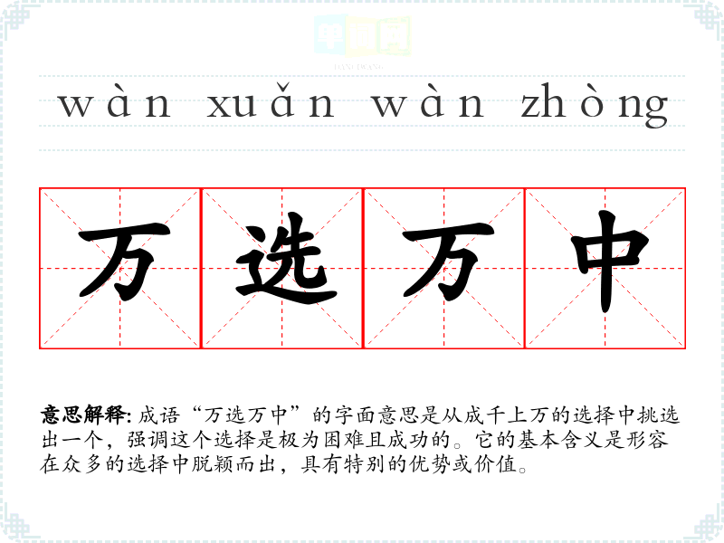 成语“万选万中”的字面意思是从成千上万的选择中挑选出一个,强调这个选择是极为困难且成功的。它的基本含义是形容在众多的选择中脱颖而出,具有特别的优势或价值。