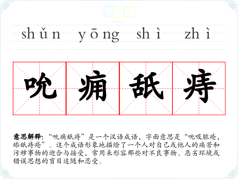 “吮痈舐痔”是一个汉语成语,字面意思是“吮吸脓疮,舔舐痔疮”。这个成语形象地描绘了一个人对自己或他人的痛苦和污秽事物的迎合与接受,常用来形容那些对不良事物、恶劣环境或错误思想的盲目追随和忍受。