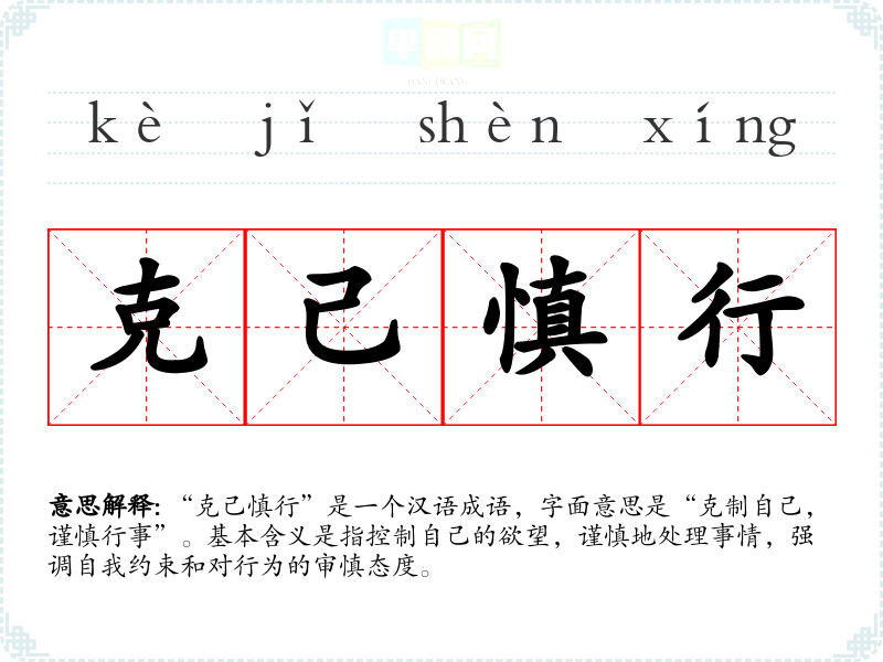 “克己慎行”是一个汉语成语,字面意思是“克制自己,谨慎行事”。基本含义是指控制自己的欲望,谨慎地处理事情,强调自我约束和对行为的审慎态度。