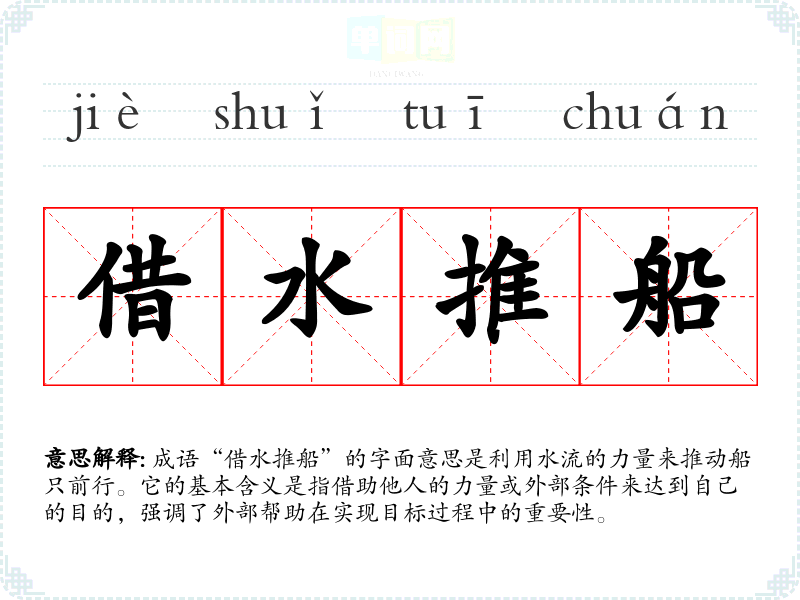 成语“借水推船”的字面意思是利用水流的力量来推动船只前行。它的基本含义是指借助他人的力量或外部条件来达到自己的目的,强调了外部帮助在实现目标过程中的重要性。