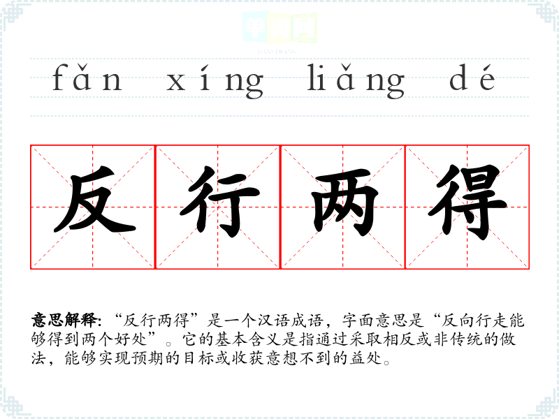 “反行两得”是一个汉语成语,字面意思是“反向行走能够得到两个好处”。它的基本含义是指通过采取相反或非传统的做法,能够实现预期的目标或收获意想不到的益处。