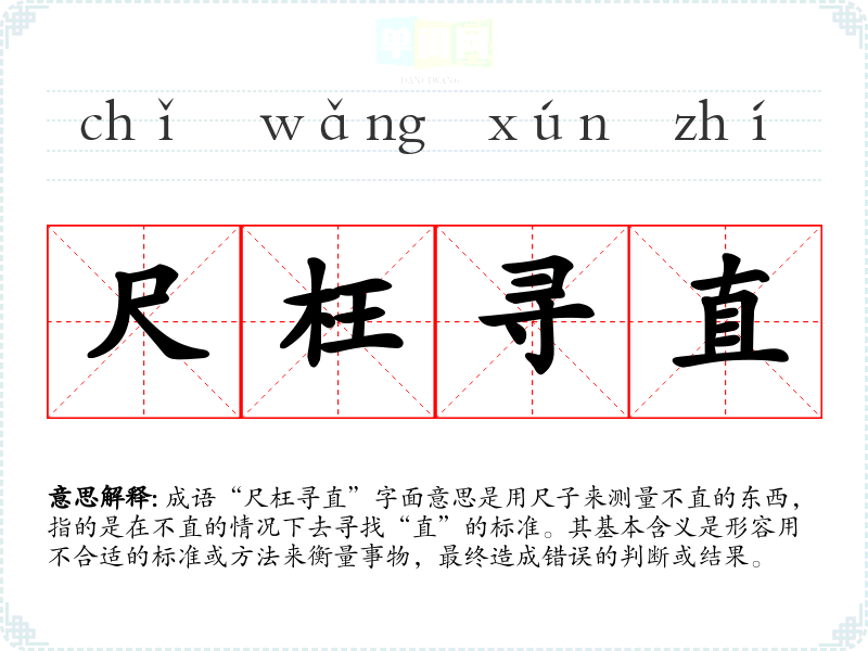 成语“尺枉寻直”字面意思是用尺子来测量不直的东西,指的是在不直的情况下去寻找“直”的标准。其基本含义是形容用不合适的标准或方法来衡量事物,最终造成错误的判断或结果。