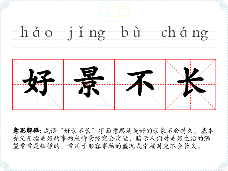 成语“好景不长”字面意思是美好的景象不会持久。基本含义是指美好的事物或情景终究会消逝,暗示人们对美好生活的渴望常常是短暂的,常用于形容事物的盛况或幸福时光不会长久。