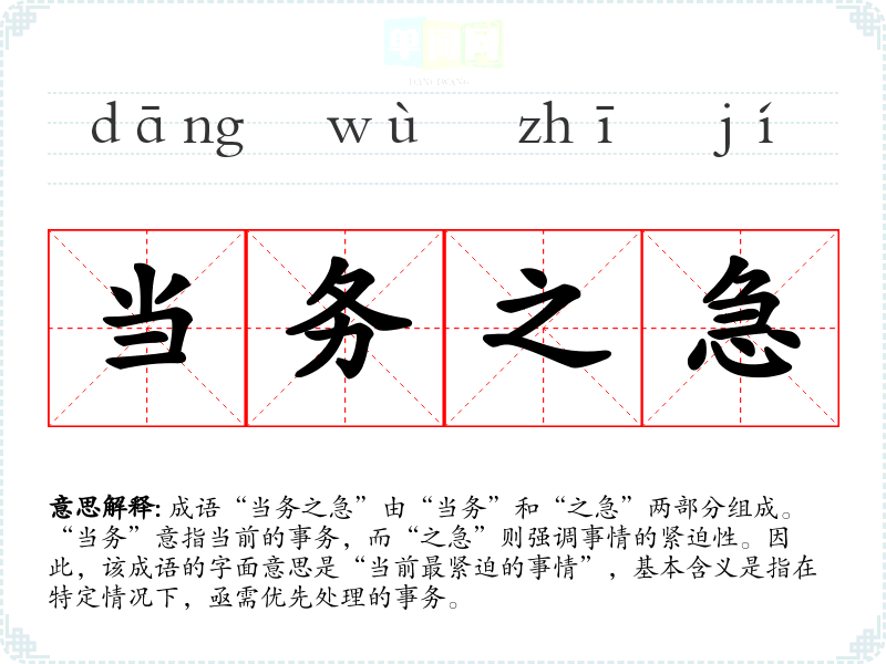 成语“当务之急”由“当务”和“之急”两部分组成。“当务”意指当前的事务,而“之急”则强调事情的紧迫性。因此,该成语的字面意思是“当前最紧迫的事情”,基本含义是指在特定情况下,亟需优先处理的事务。