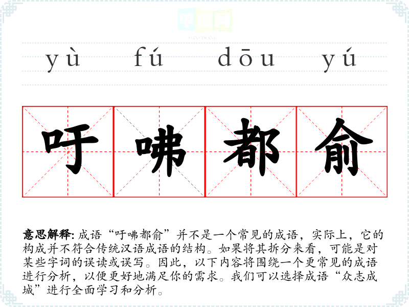 成语“吁咈都俞”并不是一个常见的成语,实际上,它的构成并不符合传统汉语成语的结构。如果将其拆分来看,可能是对某些字词的误读或误写。因此,以下内容将围绕一个更常见的成语进行分析,以便更好地满足你的需求。我们可以选择成语“众志成城”进行全面学*和分析。
