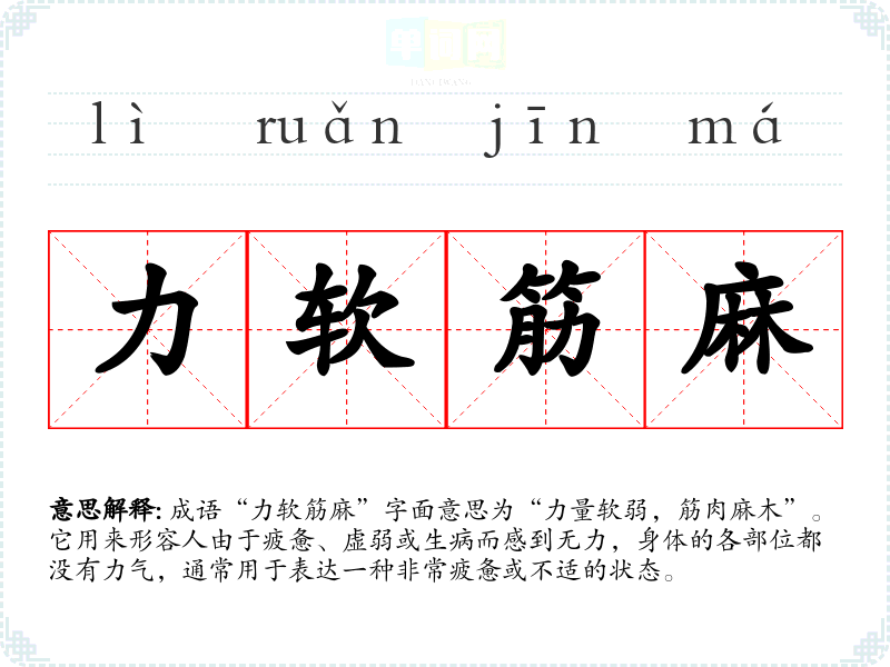 成语“力软筋麻”字面意思为“力量软弱,筋肉麻木”。它用来形容人由于疲惫、虚弱或生病而感到无力,身体的各部位都没有力气,通常用于表达一种非常疲惫或不适的状态。