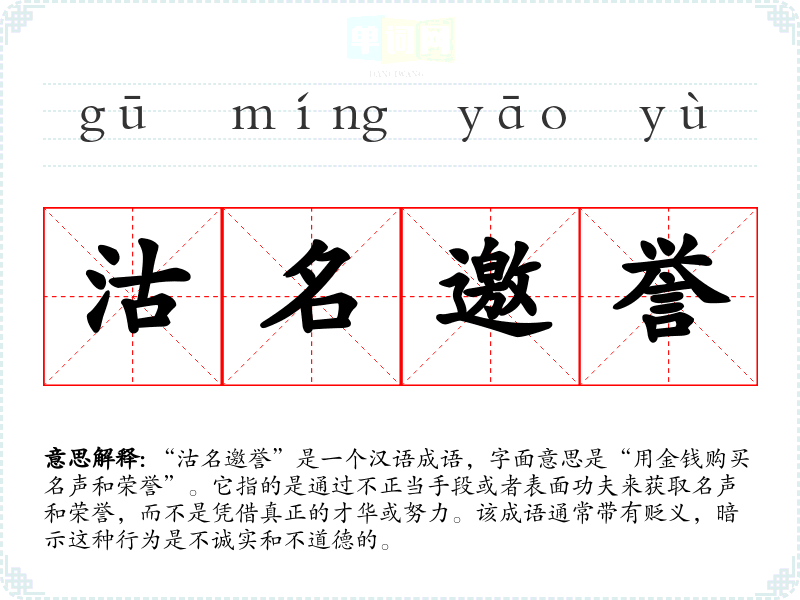 “沽名邀誉”是一个汉语成语,字面意思是“用金钱购买名声和荣誉”。它指的是通过不正当手段或者表面功夫来获取名声和荣誉,而不是凭借真正的才华或努力。该成语通常带有贬义,暗示这种行为是不诚实和不道德的。