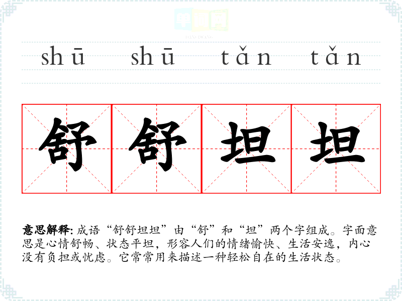 成语“舒舒坦坦”由“舒”和“坦”两个字组成。字面意思是心情舒畅、状态平坦,形容人们的情绪愉快、生活安逸,内心没有负担或忧虑。它常常用来描述一种轻松自在的生活状态。