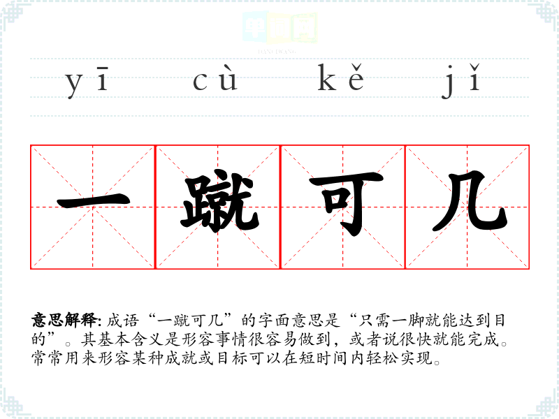 “一蹴可几”源自古代汉语,具体出处不详,但其结构可以从字面上理解为“一蹴”(一脚蹬下去)和“可几”(可以达到的程度)。这种表达形式在古代文学与口语中常用于描绘事情的简易性。