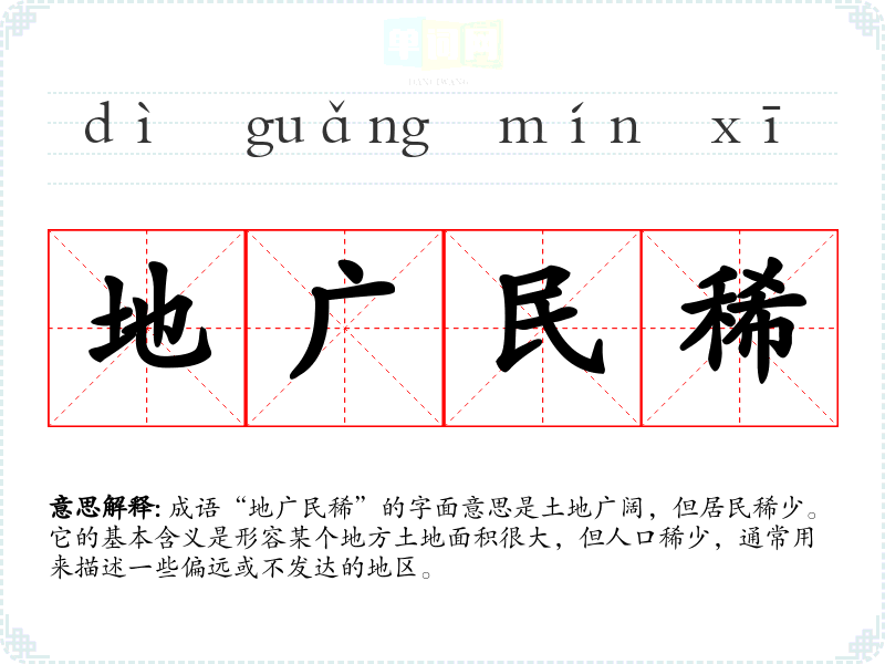 成语“地广民稀”的字面意思是土地广阔,但居民稀少。它的基本含义是形容某个地方土地面积很大,但人口稀少,通常用来描述一些偏远或不发达的地区。