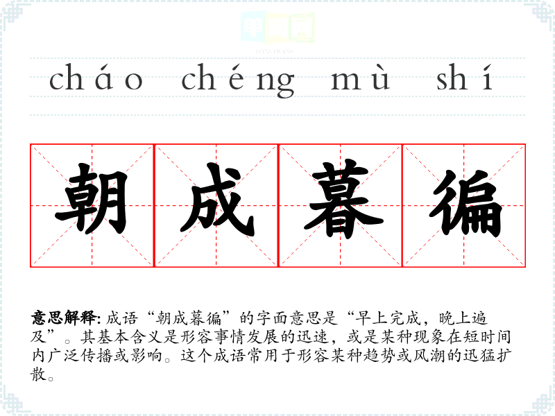 成语“朝成暮徧”的字面意思是“早上完成,晚上遍及”。其基本含义是形容事情发展的迅速,或是某种现象在短时间内广泛传播或影响。这个成语常用于形容某种趋势或风潮的迅猛扩散。