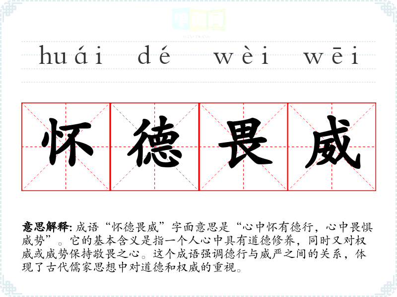 成语“怀德畏威”字面意思是“心中怀有德行,心中畏惧威势”。它的基本含义是指一个人心中具有道德修养,同时又对权威或威势保持敬畏之心。这个成语强调德行与威严之间的关系,体现了古代儒家思想中对道德和权威的重视。