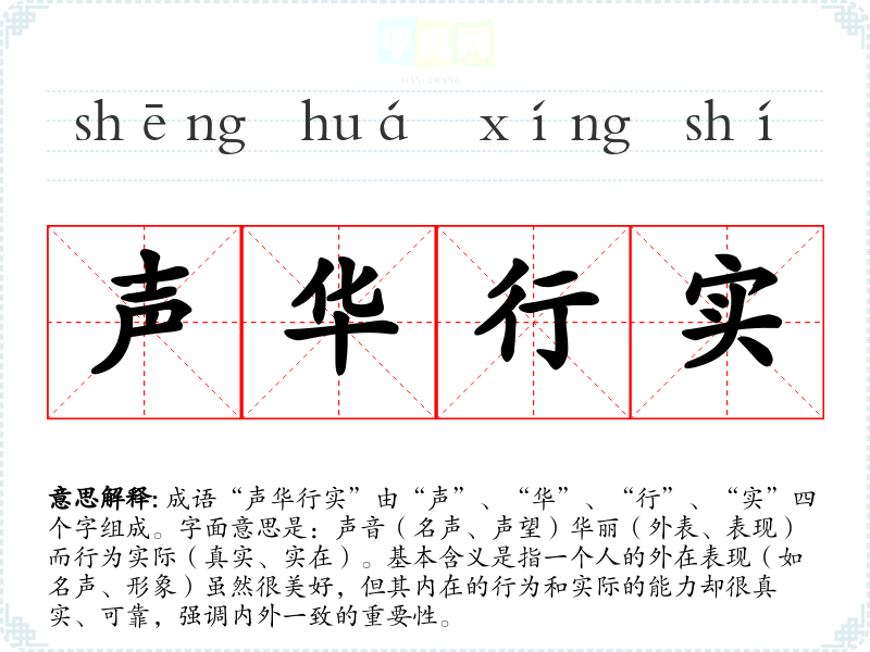 成语“声华行实”由“声”、“华”、“行”、“实”四个字组成。字面意思是:声音(名声、声望)华丽(外表、表现)而行为实际(真实、实在)。基本含义是指一个人的外在表现(如名声、形象)虽然很美好,但其内在的行为和实际的能力却很真实、可靠,强调内外一致的重要性。