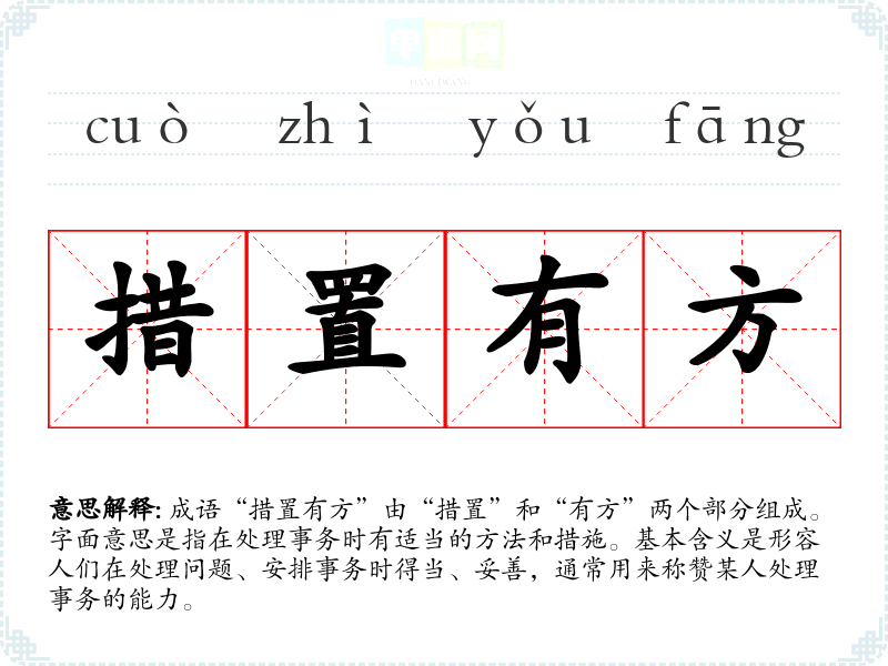成语“措置有方”由“措置”和“有方”两个部分组成。字面意思是指在处理事务时有适当的方法和措施。基本含义是形容人们在处理问题、安排事务时得当、妥善,通常用来称赞某人处理事务的能力。