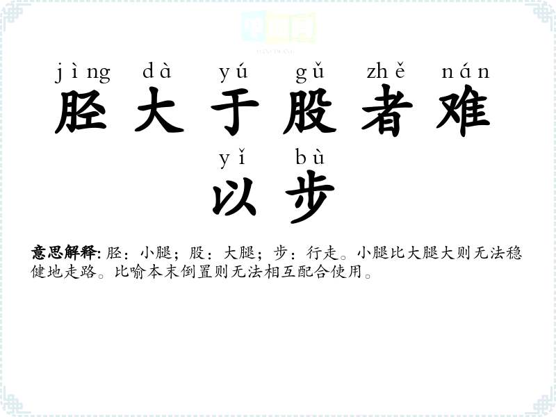 | 胫大于股者难以步 | 胫:小腿;股:大腿;步:行走。小腿比大腿大则无法稳健地走路。比喻本末倒置则无法相互配合使用。 |