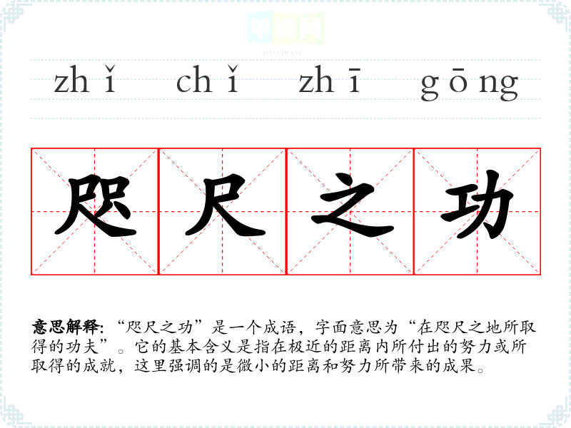 “咫尺之功”是一个成语,字面意思为“在咫尺之地所取得的功夫”。它的基本含义是指在极近的距离内所付出的努力或所取得的成就,这里强调的是微小的距离和努力所带来的成果。