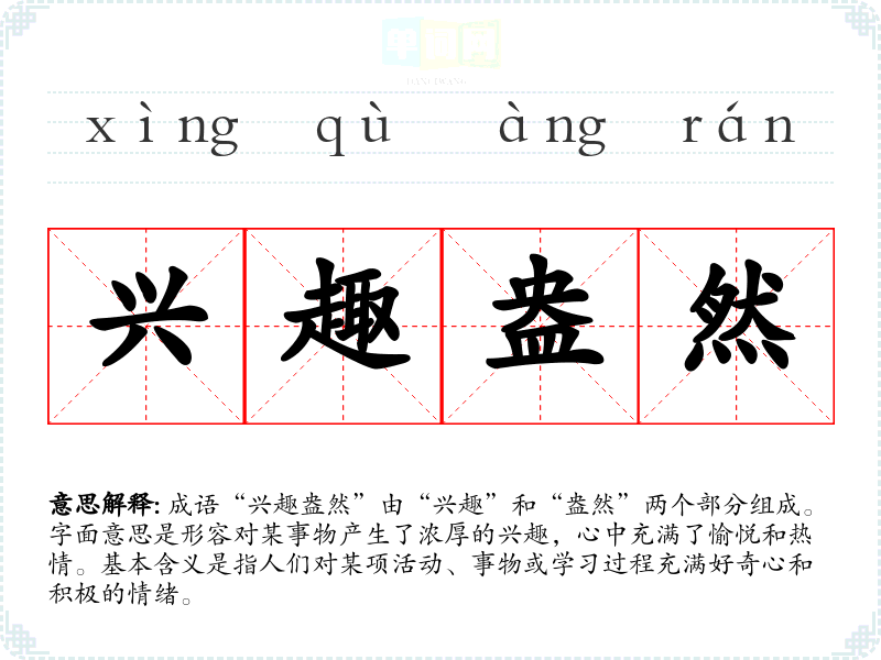 成语“兴趣盎然”由“兴趣”和“盎然”两个部分组成。字面意思是形容对某事物产生了浓厚的兴趣,心中充满了愉悦和热情。基本含义是指人们对某项活动、事物或学习过程充满好奇心和积极的情绪。