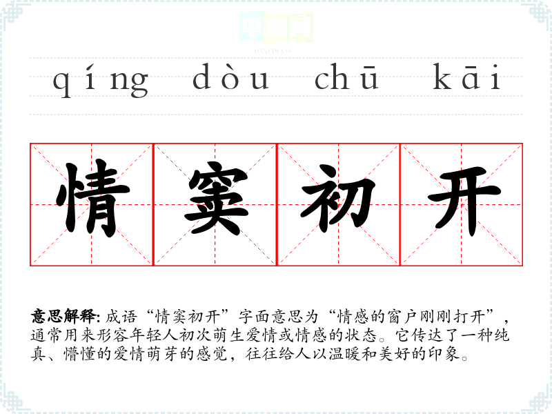 成语“情窦初开”字面意思为“情感的窗户刚刚打开”,通常用来形容年轻人初次萌生爱情或情感的状态。它传达了一种纯真、懵懂的爱情萌芽的感觉,往往给人以温暖和美好的印象。