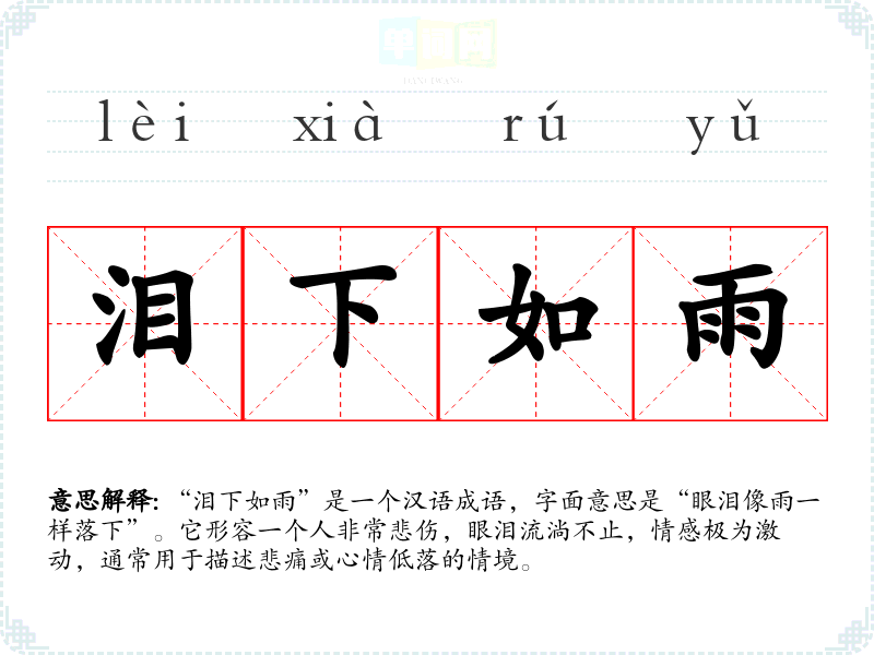 “泪下如雨”是一个汉语成语,字面意思是“眼泪像雨一样落下”。它形容一个人非常悲伤,眼泪流淌不止,情感极为激动,通常用于描述悲痛或心情低落的情境。