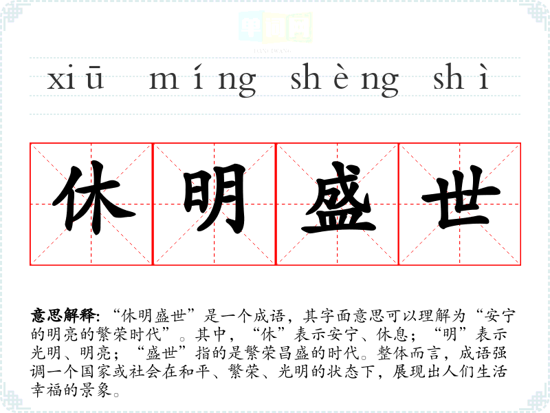 | 休明盛世 | 休明:美好,清平;盛:兴旺;世:世代。美好清平的兴盛时代。 |
