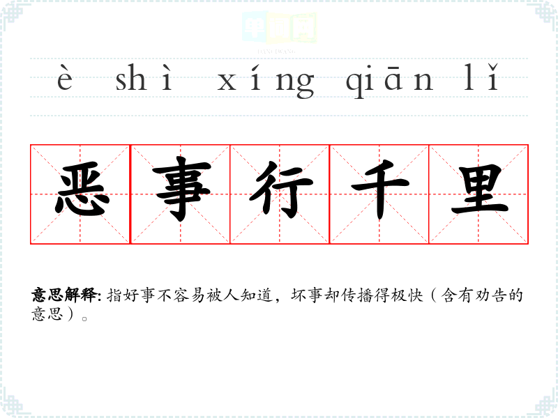 | 恶事行千里 | 指好事不容易被人知道,坏事却传播得极快(含有劝告的意思)。 |