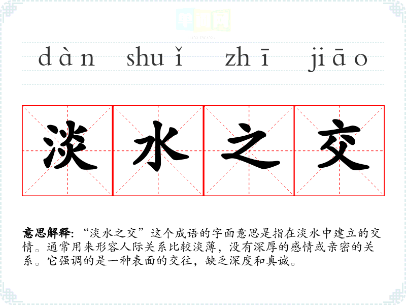 | 淡水交情 | 友情像水一样清澈。指不以势利为基础的朋友。 |
