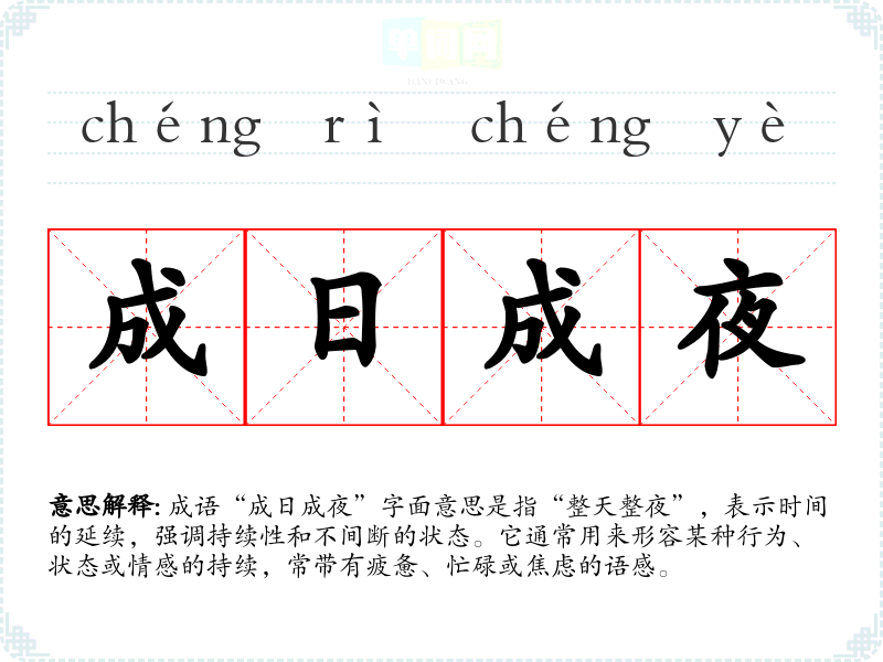 成语“成日成夜”字面意思是指“整天整夜”,表示时间的延续,强调持续性和不间断的状态。它通常用来形容某种行为、状态或情感的持续,常带有疲惫、忙碌或焦虑的语感。