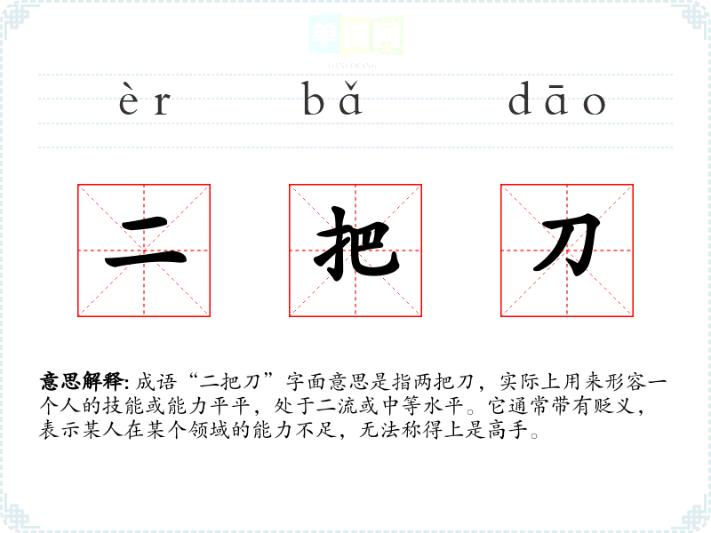 成语“二把刀”字面意思是指两把刀,实际上用来形容一个人的技能或能力平平,处于二流或中等水平。它通常带有贬义,表示某人在某个领域的能力不足,无法称得上是高手。