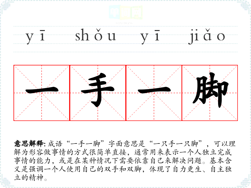 成语“一手一脚”字面意思是“一只手一只脚”,可以理解为形容做事情的方式很简单直接,通常用来表示一个人独立完成事情的能力,或是在某种情况下需要依靠自己来解决问题。基本含义是强调一个人使用自己的双手和双脚,体现了自力更生、自主独立的精神。