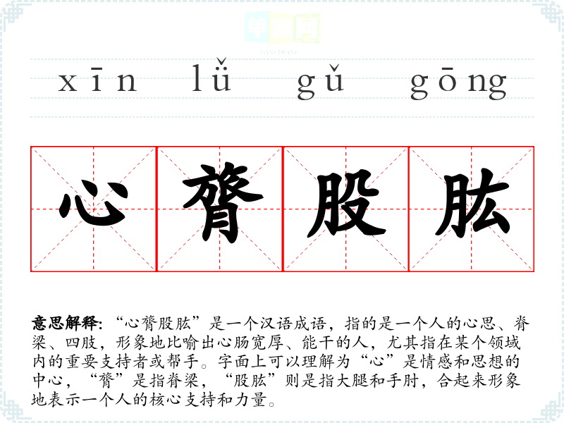 “心膂股肱”是一个汉语成语,指的是一个人的心思、脊梁、四肢,形象地比喻出心肠宽厚、能干的人,尤其指在某个领域内的重要支持者或帮手。字面上可以理解为“心”是情感和思想的中心,“膂”是指脊梁,“股肱”则是指大腿和手肘,合起来形象地表示一个人的核心支持和力量。