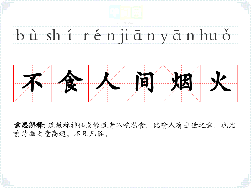 | 不食人间烟火 | 道教称神仙或修道者不吃熟食。比喻人有出世之意。也比喻诗画之意高超,不凡凡俗。 |