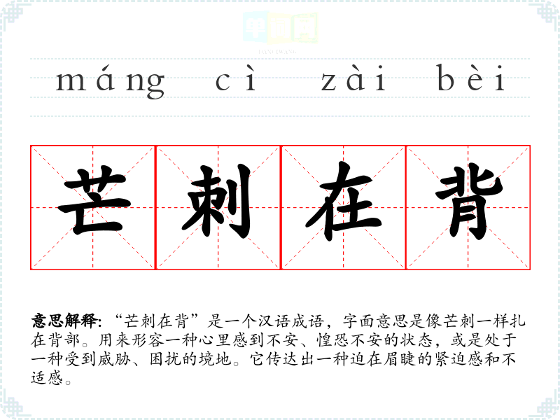 “芒刺在背”是一个汉语成语,字面意思是像芒刺一样扎在背部。用来形容一种心里感到不安、惶恐不安的状态,或是处于一种受到威胁、困扰的境地。它传达出一种迫在眉睫的紧迫感和不适感。