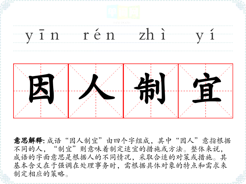 成语“因人制宜”由四个字组成,其中“因人”意指根据不同的人,“制宜”则意味着制定适宜的措施或方法。整体来说,成语的字面意思是根据人的不同情况,采取合适的对策或措施。其基本含义在于强调在处理事务时,需根据具体对象的特点和需求来制定相应的策略。