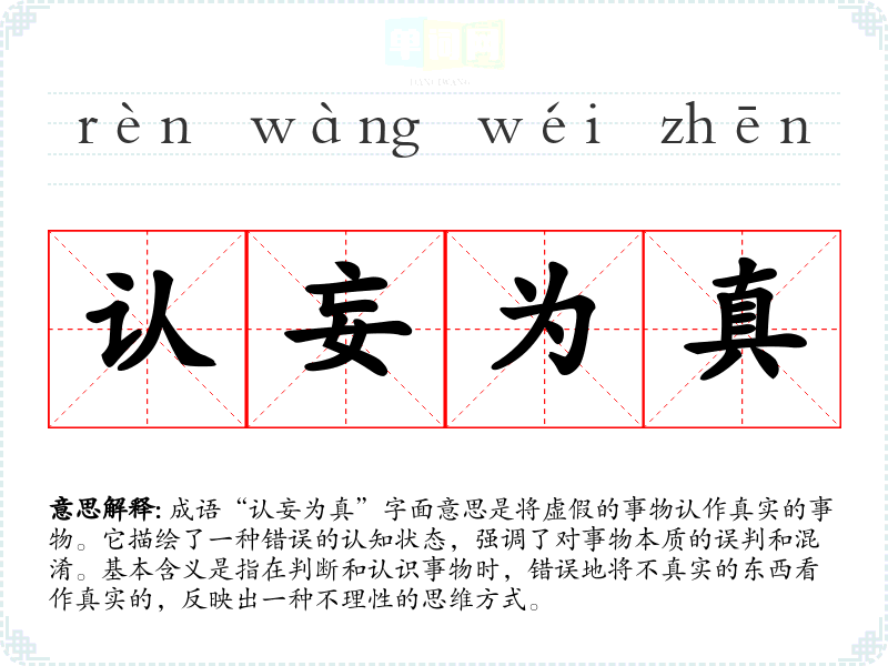 “认妄为真”并不是一个古老的成语,更多是现代汉语中常用的表达方式。其构成的“妄”和“真”两个字在古代文献中常有出现,反映了人们对于真伪、善恶的辨识能力的探讨。在古代文学中,类似的主题经常出现,比如《庄子》中对虚幻和现实的辩论,强调人们对真相的误解。