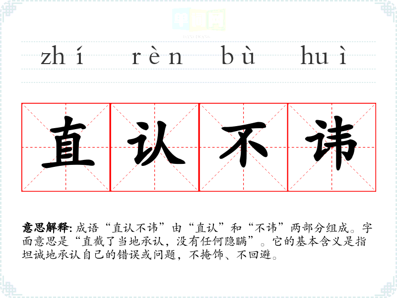 成语“直认不讳”由“直认”和“不讳”两部分组成。字面意思是“直截了当地承认,没有任何隐瞒”。它的基本含义是指坦诚地承认自己的错误或问题,不掩饰、不回避。