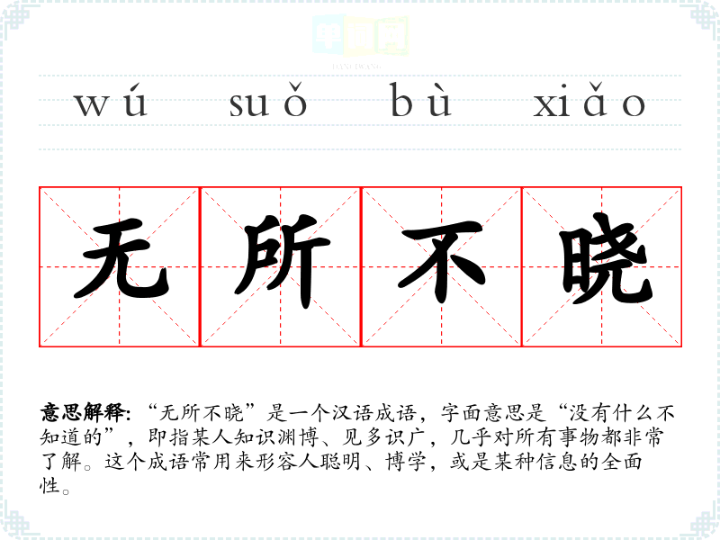 “无所不晓”是一个汉语成语,字面意思是“没有什么不知道的”,即指某人知识渊博、见多识广,几乎对所有事物都非常了解。这个成语常用来形容人聪明、博学,或是某种信息的全面性。