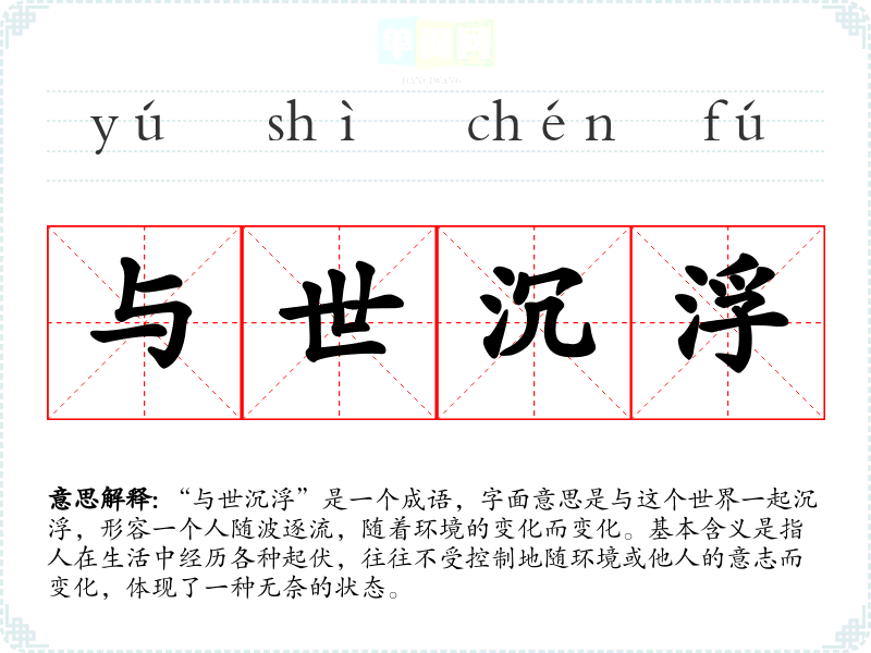 “与世沉浮”是一个成语,字面意思是与这个世界一起沉浮,形容一个人随波逐流,随着环境的变化而变化。基本含义是指人在生活中经历各种起伏,往往不受控制地随环境或他人的意志而变化,体现了一种无奈的状态。