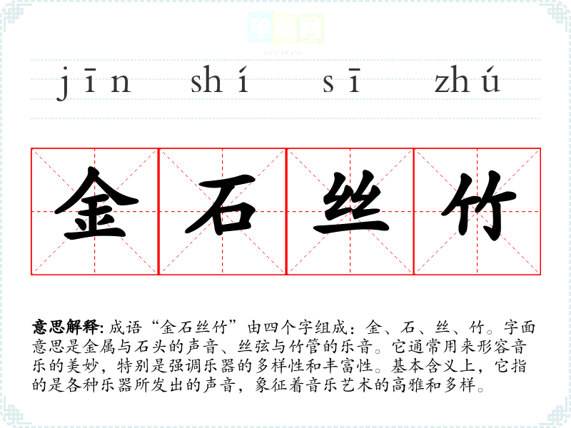 成语“金石丝竹”由四个字组成:金、石、丝、竹。字面意思是金属与石头的声音、丝弦与竹管的乐音。它通常用来形容音乐的美妙,特别是强调乐器的多样性和丰富性。基本含义上,它指的是各种乐器所发出的声音,象征着音乐艺术的高雅和多样。