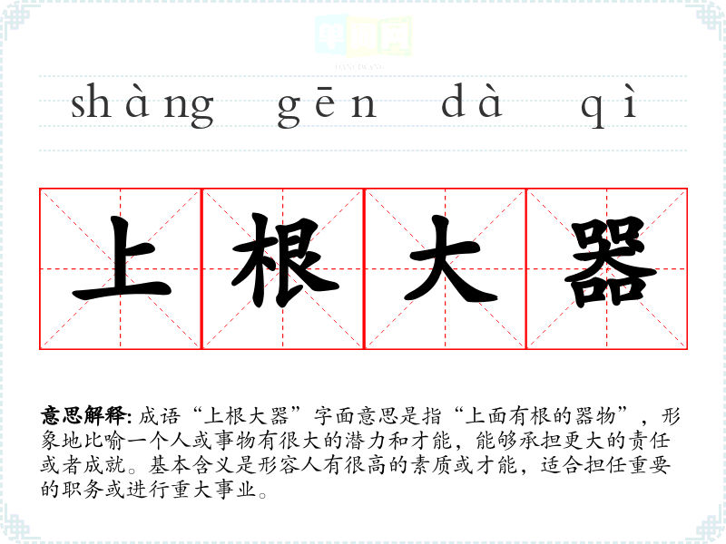 成语“上根大器”字面意思是指“上面有根的器物”,形象地比喻一个人或事物有很大的潜力和才能,能够承担更大的责任或者成就。基本含义是形容人有很高的素质或才能,适合担任重要的职务或进行重大事业。