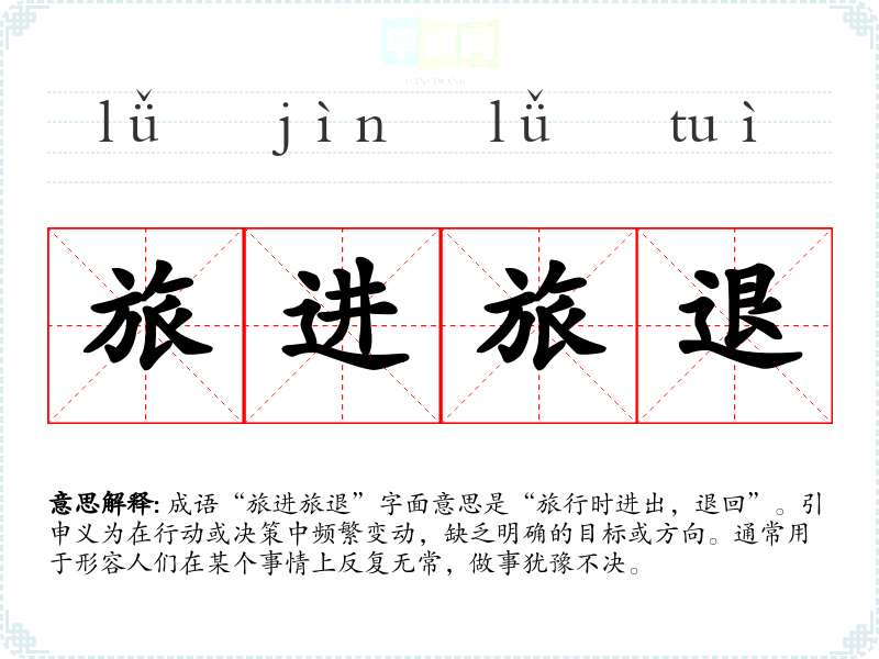 成语“旅进旅退”字面意思是“旅行时进出,退回”。引申义为在行动或决策中频繁变动,缺乏明确的目标或方向。通常用于形容人们在某个事情上反复无常,做事犹豫不决。